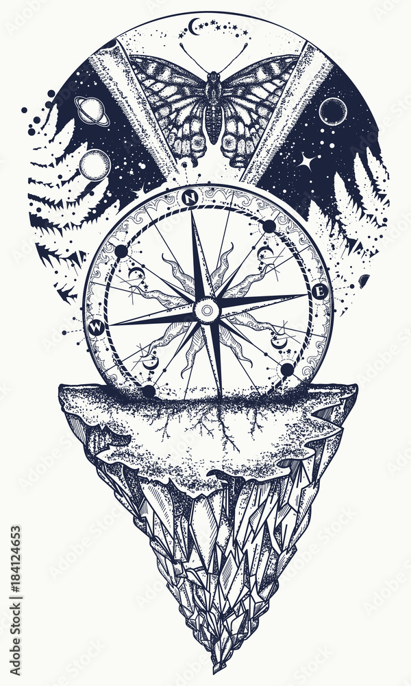 Universe And Butterfly Tattoo Art Symbol Of Esoterics Mysticism Astrology Dream Surreal Universe Compass Mountains Planet And Star T Shirt Design Stock Vector Adobe Stock